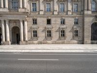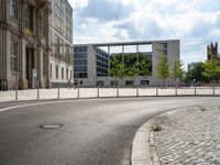 The cityscape of Berlin, Germany is revealed in a profile view of a road, classic and modern architecture, a plaza, and a museum, with clouds in the sky above a business district on a sunny day.