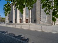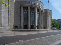 Experience the vibrant city life of Berlin in Europe, Germany. The classic architecture of the Volksbühne theater casts shadows on the city's roads and curbs, under a clear sky. The urban design blends seamlessly with the historical buildings, showcasing a mix of traditional and modern profiles. Hard shadows create a striking contrast against the asphalt roads, while the foreground captures the essence of urban living in this dynamic city.