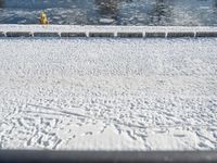 a fire hydrant near the edge of a river covered in snow next to a dock