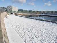 snowy day at the river near the waterfront with a bridge in the background and water flowing below