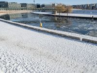 a snow covered canal with water and ice surrounding it, with buildings in the distance