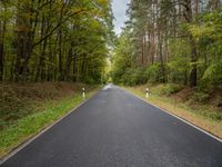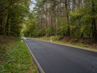 The sunlit natural environment of Berlin, Germany, is revealed, with its deciduous and evergreen vegetation, grass, shrub and tree branches, lush forest, and straight asphalt roads cutting through the landscape.