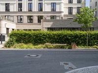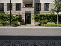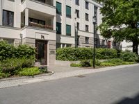 The modern architecture and infrastructure of Berlin, Germany, is framed by the foliage and cobblestone streets of this European city. Buildings, fixtures, and outdoor benches create a residential area with a clear sky overhead.