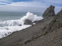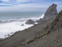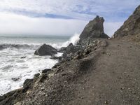 Aerial view of the Big Sur region of California, USA, featuring the Pacific Coast Highway, moraines, coastal bluffs, rock formations, mountain landforms, and lush vegetation, on a grey day.