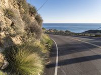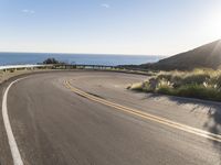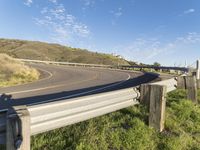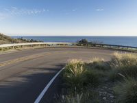 A sunny day on the Big Sur Coastal Highway in California, USA. The road winds through the wilderness, lined with yellow vegetation, trees, and shrubs. An Armco barrier, bridge, and reservoir can be seen in the distance, with a clear sky above.