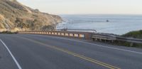 The Pacific Coast Highway winds along California's Big Sur coastline, offering travelers a stunning view of the ocean, sound, shore, cliffs, and mountains. The infrastructure of the highway, including the guard rail, concrete bridge, and Armco barrier, stand in stark contrast to the natural landscape.