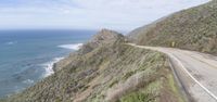 A view of Big Sur, California, USA, a coastal mountain landscape with a concrete bridge, an armco barrier, and a curving road along the Pacific Coast Highway, illuminated by the sun with a clear sky and contrails in the background.