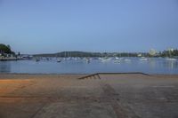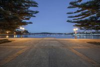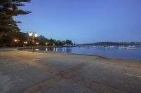 A boat glides across the calm surface of a coastal lake under a clear night sky