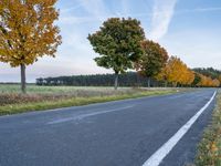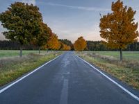 a paved road in an open field with trees in fall color and no one is on the side