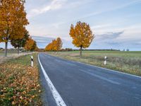 a lone highway runs through an open field in autumn season, with trees turning bright yellow