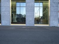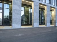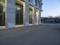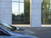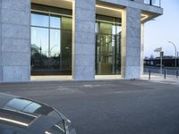 A compact car is seen parked in front of a modern architecture building with blue glass facade in the business district of Berlin, Germany at the break of day. The asphalt road surface, concrete curb, and shadows from the trees create a snapshot of this urban public space.