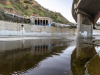 The morning light casts a hard shadow on a bridge and its underpass in Los Angeles, California, USA. The wet road and river provide a picturesque backdrop to the residential suburban area.