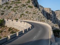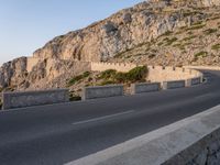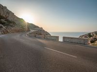 A majestic sunrise over the Balearic Islands of Mallorca, Spain. An elevated road with an Armco barrier, guard rails, and an ocean view in the background, all illuminated by the bright sunshine and clear blue sky of the break of day.