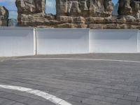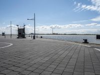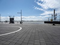 A cobblestone road surface runs through a public space in the German city of Bremen, with a pier jutting out into the harbor and a skyline of urban architecture in the background. Gas, electricity, concrete, and asphalt provide a composite material for the road, with trees and street lights lining the horizon.