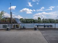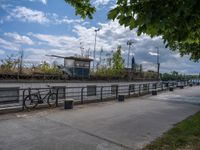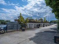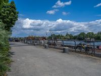 Berlin's urban design is brought to life along the river and canal, where city life thrives under the European sky. Concrete structures cast hard shadows on the water's surface, creating a picturesque profile of the city. Jetty and piers line the riverbank, offering a landing spot for urban explorers to soak in the beauty of the city. Clouds drift overhead, adding a dynamic element to Berlin's urban landscape.