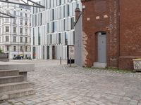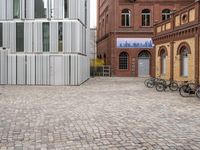 The classic architecture of a residential area in Berlin, Germany is illuminated in the early morning dawn. A cobblestone road surface with a bicycle parked near a loading dock, surrounded by brickwork, fixtures, and vegetation create a beautiful urban design.