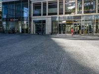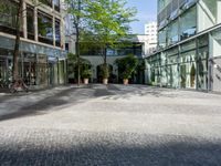 A view of the modern mixed-use architecture in the downtown business district of Berlin, Germany. The clear sky illuminates the cobble stone road surface, property facades, and public plaza surrounded by trees, creating a human settlement with a unique urban design. The infrastructure includes a variety of residential and office buildings, as well as a variety of other open spaces.