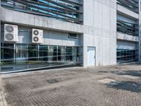 A top down view of the business district in Kaohsiung, Republic of China, showing the hard shadows of the elevated office buildings and pavers in this bustling city in Formosa.