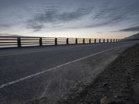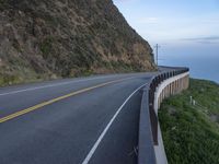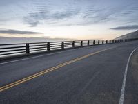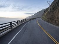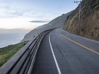 Scenic view of the California coastal highway at dawn, with a winding road and asphalt surface, overlooking the ocean and surrounded by beautiful landscape and mountains.