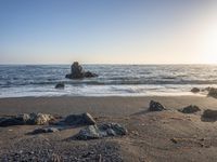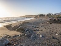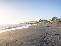 A stunning dawn at the coastal shores of California, USA. The sandy beach, clear blue water, and rocky landscape create a picturesque scene of nature and geology. The sun rises above the horizon, casting a warm glow on the open space and reflecting on the calm waves of the ocean. The clear sky and sunshine make it a perfect day to enjoy the natural environment and relax by the shore.
