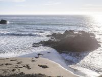 A winding road surrounded by nature takes travelers through a coastal paradise of Montaña de Oro State Park in California, USA. The panoramic view from an elevated perspective highlights the natural environment of the park, from the rocky headlands and bluffs to the sandy beach and grassy highland.