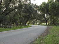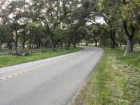 A beautiful dawn road in California, USA, with low landscape, green grass, and trees. The rural scenery is surrounded by nature and vegetation, creating a peaceful and serene atmosphere along the curved recreational lane. The road leads to agricultural farms and is a perfect escape into the natural environment. The road surface, made of asphalt, blends seamlessly with the spring path lined with woody plants. The infrastructure provides a picturesque view of the break of day.
