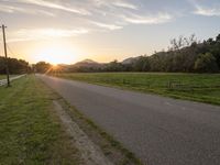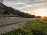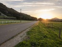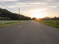 A low landscape of mountains and grass in California, USA. The sun is visible in the sky, casting sunlight on the rural scenery. A road stretches straight down the green landscape, lined with fences. The asphalt road surface leads to the horizon, creating a picturesque view of California countryside.