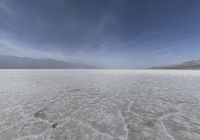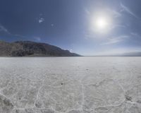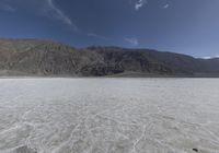 A stunning view of the California desert landscape in Death Valley, USA. The vast open space, surrounded by mountains, showcases the dramatic and emotional beauty of the salt surface and dry atmosphere. A popular tourist attraction, this plain offers a serene and sunny environment with a calm sea and lake in the horizon. The winter sky is filled with beautiful clouds, illuminating the water resources and highland hills. The mountain landforms and fell create a geologically rich and coastal scenery, making it a perfect destination for nature lovers and tourists seeking an unforgettable experience.