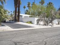 A mid-century modern estate in a lush Palm Springs neighborhood in the Sonora Desert of California, USA, with a driveway, curb, asphalt road, tile wall, brick wall, and vegetation.