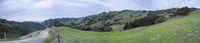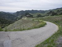 Scenic view of the California highland landscape at dawn with clouds in the sky and a curving road on asphalt, surrounded by mountains, lush grass, and rural countryside.