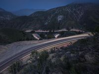 Aerial view of a high-speed drive on a highway in California, USA, showcasing the stunning landscape of the mountain pass at night with illuminated infrastructure and light streaks.