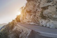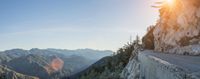 A winter morning view of a winding mountain road, lined with an Armco Barrier, surrounded by rocky outcrops, in the rugged landscape of California, USA. The clear sky offers a sunny overview of the cliffs, hills, and mountain ranges, with a bed of frozen rock and asphalt. A breathtaking experience of nature and infrastructure.