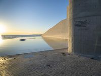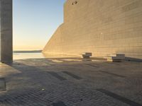 A composite material of cobble stone, asphalt and wood create a modern architecture in the coastal city of Lisbon, Portugal. The azure ocean, lake and horizon line the urban landscape filled with shade, sunlight and hard shadows. The clear sky and sunshine at the break of day creates a calm atmosphere of tints and shades.