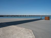 The sun rises over the ocean horizon and the shoreline of Holland, revealing a symmetrical landscape full of fluid water resources, wind turbines, bridges, roads, and trees. A clear sky and hard shadows create a peaceful backdrop for this natural environment, while asphalt and composite materials provide a backdrop of urban design.