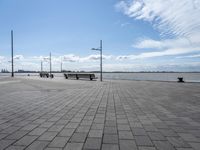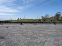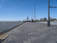 A view of Bremerhafen, Germany on a calm and sunny day. The urban design includes asphalt roads with a street light, a public plaza with a composite material walkway, a pier and a lake with a grassy jetty. The horizon is made up of a clear sky with a few cumulus clouds.