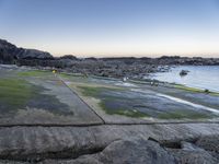 The dawn brings forth a peaceful landscape of water, sky, and coastal landforms at the entrance to a highway in Portugal. The clear sky and calm waves reflect the sunlight off the concrete shoreline, wood boat ramp, and grass-covered slope. The water resources of this rural landscape bring the tranquility of nature to the highland plain.