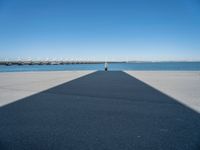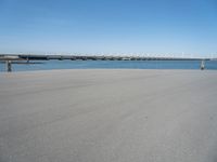 A stunning landscape of the Netherlands featuring a shoreline with a pier, a lake, a wind turbine, a bridge, a channel, a reservoir, a salt evaporation pond, trees, and a hard shadow of a roof on a road surface with a tar composite material, all under an azure sky and a horizon of clouds.