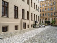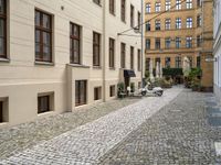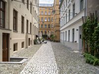 The cobblestone road of a residential suburb in Berlin leads to a courtyard surrounded by classic architecture and a vertical garden, creating the perfect urban design for a sunny day at home.