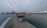 The sky illuminated by the rising sun reflects off the coastal waters of Lake Michigan at the pier in Chicago, USA, offering a stunning view of the city's modern architecture and iconic skyline.