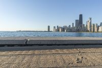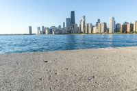 The city of Chicago, Illinois, USA, at dawn, with its modern architecture, waterfront, harbor, recreational areas, and natural environment in the backdrop of a clear blue sky, illuminated by the morning sunlight.