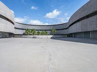 Low-angle view of a modern city building with a concrete facade and open spaces, set against a blue sky and clouds in Spain, Europe.