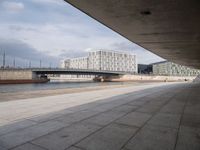A straight-down-the-road profile view of Berlin, Germany, showcases the contrast between the modern architecture of the city and its clear-blue sky. The surface of the road, the bridge, and the underpass add a unique urban design to the cityscape.
