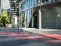 A vibrant street corner in Berlin, Germany, displaying a mix of modern and traditional architecture. Tourists and locals alike traverse the city's urban landscape, enjoying the unique blend of real estate, buildings, public spaces, and infrastructure. The European metropolitan area of Potsdamer Platz stands out with its pink facades and hard shadows cast on the city's roads and sidewalks.