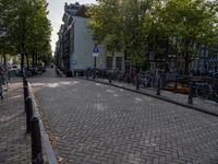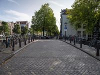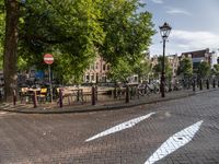 Strolling down a busy Amsterdam street, with classic architecture, infrastructure, and vegetation, it's easy to appreciate the urban design of this European city. A bicycle wheel stands out in the foreground against the asphalt road, with a restaurant and residential area in the background, illuminated by a street light and the bright sky above.