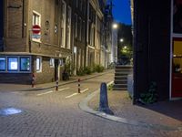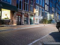 The break of day reveals the classic architecture of Amsterdam, Netherlands. The road surface is lined with asphalt, vegetation, curbs, and fixtures, with tire and wheel of a bicycle in the foreground. Artificial light illuminates the residential area, public space, and infrastructure, creating an urban design that is unique to the city.