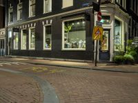 A classic, urban architecture and infrastructure in the residential area of Amsterdam, Netherlands. The road surface of asphalt is illuminated by artificial light from the street light and automotive lighting. Shops, storefronts, and doorways have a distinctive urban design, with tints and shades of the pavement and facade fixtures adding to the night-time atmosphere.