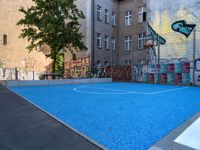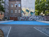 An urban open space with a basketball court, graffiti wall and residential area in Berlin, Germany. The road surface is asphalt and the architecture consists of brick and tar. The view from the building's window reveals a courtyard with grass, trees and colorful paint on the facade of the property.