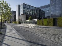 an empty sidewalk in front of a building with windows on the sides of it and green bushes