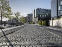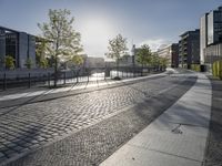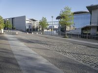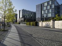 A sunny day in Berlin, Germany showcases the metropolitan area's modern architecture, residential buildings and mixed-use properties, glass walls, cobblestone roads, tree-lined sidewalks, public spaces, and riverside business districts. A view of the cityscape from low to high reveals a vibrant city life in Europe.