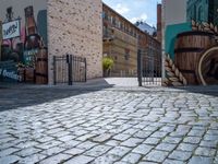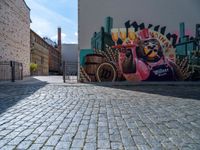A cobblestone street in Berlin, Germany, littered with graffiti on the walls. The hard shadow of the road creates an urban design as people drive by and eat out at the restaurant entry.